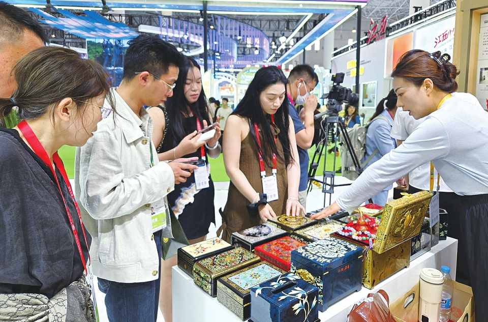 山西展區(qū)的平遙推光漆器吸引了眾多客商關(guān)注的目光。