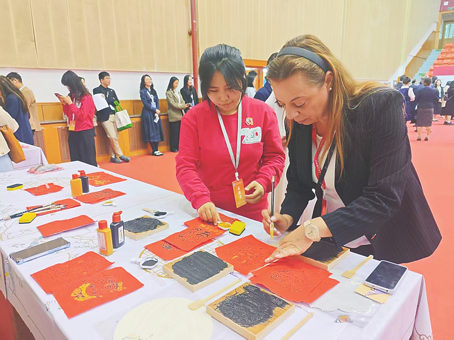 外國友人正在體驗?zāi)景婺戤?。本報記者張劍雯攝