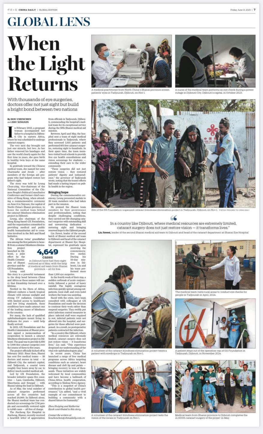 《中國日報(bào)國際版》6月13日第7版Global Lens欄目截圖數(shù)千例眼科手術(shù)背后,山西援外醫(yī)療隊(duì)醫(yī)生們不僅為非洲患者重賦光明,更在兩國間架起友誼之橋。