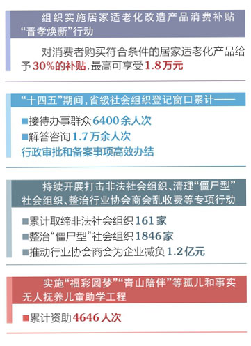 “十四五”期間,我省堅持“規(guī)范與發(fā)展并重、監(jiān)管與服務(wù)并舉”,持續(xù)深化改革,健全體制機(jī)制,完善政策措施,推動社會組織高質(zhì)量發(fā)展取得新成效。推行“零見面審批、最多跑一次”和線上年報“零跑動”,省、市、縣三級社會組織登記實現(xiàn)“一網(wǎng)通辦”。統(tǒng)一規(guī)范申請材料、表格表單、辦事流程、章程文本等,政務(wù)服務(wù)標(biāo)準(zhǔn)化、規(guī)范化水平持續(xù)提升。推進(jìn)社會組織規(guī)范化建設(shè),健全綜合監(jiān)管、聯(lián)合執(zhí)法、資金管理等制度機(jī)制,加強(qiáng)對社會組織名稱、宗旨、業(yè)務(wù)范圍、發(fā)起人和擬任負(fù)責(zé)人的審核把關(guān),強(qiáng)化對社會組織內(nèi)部治理、人員、資金、活動等日常監(jiān)管。持續(xù)開展打擊非法社會組織、清理“僵尸型”社會組織、整治行業(yè)協(xié)會商會亂收費等專項行動,推動行業(yè)協(xié)會商會為企業(yè)減負(fù)1.2億元。