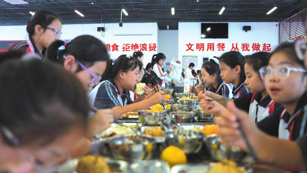 走進(jìn)長(zhǎng)城小學(xué),1535.25平方米的校內(nèi)餐廳里,900余名師生在老師引導(dǎo)下有序取餐、就餐,餐盤(pán)里葷素搭配的飯菜色香味俱全,孩子們的臉上滿是笑意?!耙郧鞍謰尮ぷ髅Γ颐刻斓米\?chē)來(lái)回跑,現(xiàn)在有了午托太幸福了!午餐每天不重樣,有肉有湯,比媽媽做得還香!”六年級(jí)學(xué)生李宸慶捧著飯菜笑著說(shuō)。