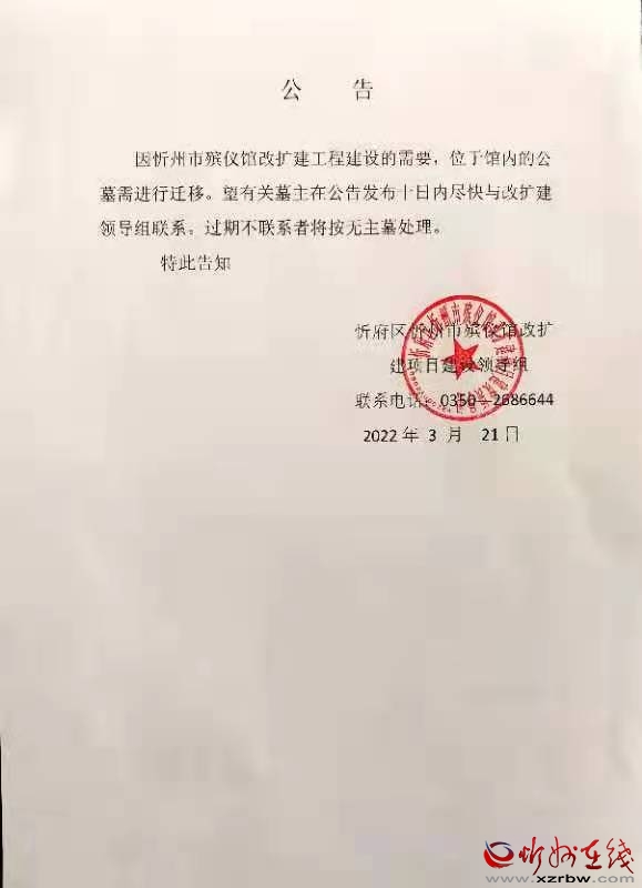 因忻州市殯儀館改擴(kuò)建工程建設(shè)的需要,位于館內(nèi)的公墓需進(jìn)行遷移(不涉及骨灰寄存)。望有關(guān)墓主在公告發(fā)布十日內(nèi)盡快與改擴(kuò)建領(lǐng)導(dǎo)組聯(lián)系。過期不聯(lián)系者將按無主墓處理。