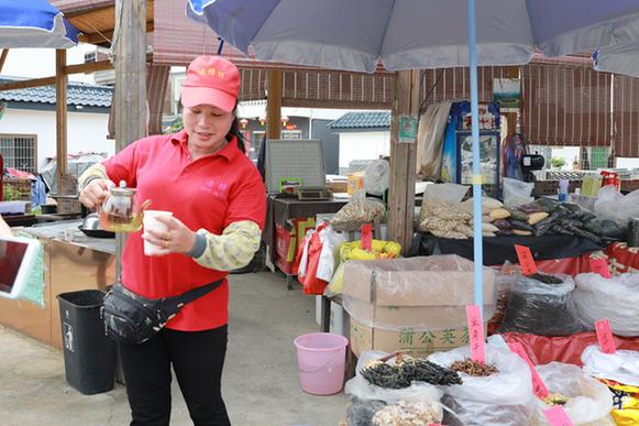 “天太熱,來(lái)喝口我這免費(fèi)的茶?!辈湃脒B樟村村口,記者便被熱情的村民陸秀媚招呼到了自己的攤位。紅茶、本地枝葉、山柑皮、筍干……她的攤位琳瑯滿目,擺得滿滿當(dāng)當(dāng)。陸秀媚告訴記者,自己曾經(jīng)在市里賣童裝,剛開(kāi)始還能掙到些錢,后來(lái)隨著網(wǎng)購(gòu)興起,實(shí)體店的生意越來(lái)越難做。2018年,在習(xí)近平總書記來(lái)連樟村視察后,看到家鄉(xiāng)越變?cè)胶茫懶忝倪x擇了回到村里創(chuàng)業(yè)。