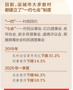 目前,運城市大多數(shù)村都建立了“一約七會”制度——“一約”是村規(guī)民約,“七會”是村民議事會、紅白理事會、老年協(xié)會、新鄉(xiāng)賢理事會、道德評議會、禁賭禁毒協(xié)會和民調理事會。這“一約七會”制度的不斷健全,對破除鄉(xiāng)村社會陋習、引導群眾移風易俗、引領社會新風、化解矛盾糾紛,維護基層社會和諧穩(wěn)定起到了重要作用。村民的正能量多了,鄉(xiāng)村的負面事情少了,社會治安狀況得到明顯改善,群眾安全感顯著增強。2019年運城市農(nóng)村治安案件同比下降31.2%,刑事案件下降14.3%;2020年一季度,治安案件下降86.3%,刑事案件下降59.7%。