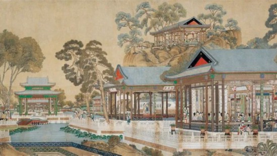 畫(huà)面中,曲折縈紆的溪水自蘅蕪院流經(jīng)牡丹亭、凹晶館、蓼風(fēng)軒、秋爽齋等地,最終蜿蜒向畫(huà)面遠(yuǎn)方,層層亭臺(tái)廊橋,一望無(wú)盡。許軍杰認(rèn)為,此繪之溪水應(yīng)為沁芳溪。正如周汝昌先生在《北京大觀(guān)園·引言》中評(píng)價(jià):“大觀(guān)園全部的主脈與‘靈魂’是一條蜿若游龍的‘沁芳溪’。亭、橋、泉、閘,皆以此二字為名,可為明證。一切景觀(guān),依溪為境”,“大觀(guān)園的一切池、臺(tái)、館、泉、石、林、塘,皆以沁芳溪為大脈絡(luò)而盤(pán)旋布置?!眻D中的這曲溪水亦有異曲同工之功能,將兩岸建筑、山石、樹(shù)木巧妙地聯(lián)系在一起,使其形成一個(gè)有機(jī)的園林整體。(李君娜)