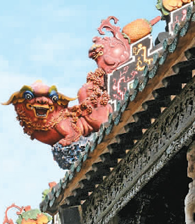 “三雕兩塑”(石雕、木雕、磚雕、陶塑、灰塑)是嶺南傳統(tǒng)建筑常用構件。陳家祠建筑屋頂上裝飾著層疊錯落、精致繁復的陶塑和灰塑,堪稱一大亮點。曾翔介紹,最頂層的陶塑瓦脊就是著名的“石灣陶”,在廣東佛山石灣鎮(zhèn)燒制而成,內(nèi)容一般以粵劇故事、花卉和吉祥圖案為主。瓦脊下方的基座是灰塑?;宜艿闹谱鞴に嚤容^特別,用石灰摻入糖膠、稻草、糯米等混合發(fā)酵后,往房頂?shù)你~鐵骨架上填抹塑形,再涂上顏色?;宜軟]有經(jīng)過高溫燒制,容易受風雨侵蝕而剝落掉色,每隔五六年就要進行保養(yǎng)修復。