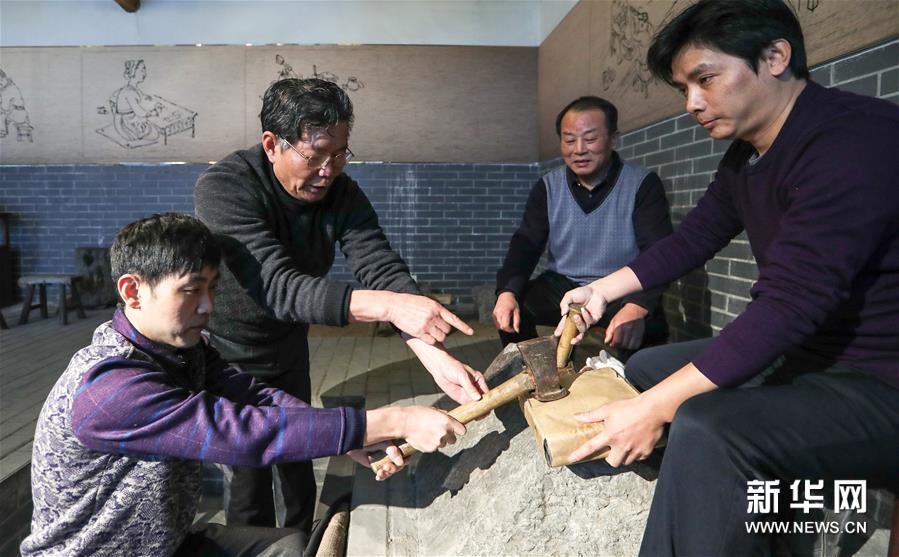 在南京金線金箔總廠,王必生(左二)向徒弟講解用錘方法(2019年12月3日攝)。新華社記者 楊磊 攝