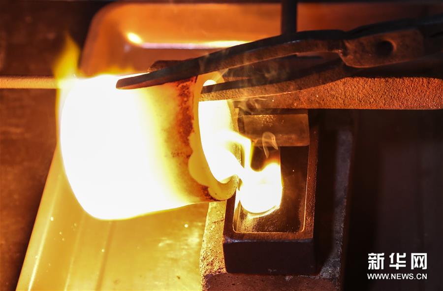 在南京金線金箔總廠,工人將熔化的金水倒入容器(2019年12月12日攝)。68歲的王必生是江蘇南京人,1973年進(jìn)入南京金箔鍛制技藝項(xiàng)目保護(hù)單位——南京金線金箔總廠,師從老藝人譚柱石,他虛心學(xué)習(xí),潛心鉆研,很快掌握打金箔的技藝。他致力于技術(shù)革新和改造,參與機(jī)械打箔機(jī)、自動(dòng)打箔機(jī)的研制。2009年他被評(píng)為國(guó)家級(jí)非物質(zhì)文化遺產(chǎn)項(xiàng)目南京金箔鍛制技藝代表性傳承人。 金箔鍛制技藝,俗稱“打金箔”,歷史悠久。在南京一些地方,金箔生產(chǎn)仍然延用古代傳下的制作工序,鍛制過(guò)程包括化金條、拍葉、做捻子、沾捻子、打開(kāi)子、裝開(kāi)子、出具、切箔等。 金箔廣泛應(yīng)用于建筑裝飾,還可應(yīng)用于雕塑、工藝品、書畫、食品藥品、服飾等方面的貼金裝飾和制作。南京金箔品種有真金箔、銅箔、銀箔、鋁箔,薄如蟬翼、色澤純正、厚薄均勻,產(chǎn)品銷往海內(nèi)外。 目前,王必生所在的南京金線金箔總廠是國(guó)家級(jí)非物質(zhì)文化遺產(chǎn)代表性項(xiàng)目保護(hù)單位。工廠把人工打金箔的遺址保護(hù)起來(lái),并成立了金箔大師工作室,加強(qiáng)金箔技藝的推廣,加大傳承人的培養(yǎng)力度。已經(jīng)退休的王必生被工廠返聘,負(fù)責(zé)打箔技藝展示和傳承。他說(shuō),現(xiàn)在機(jī)器打箔越來(lái)越多,但人工打出的金箔的更加柔軟,齊整。他希望這一傳統(tǒng)技藝能夠繼續(xù)傳承下去。新華社記者 楊磊 攝