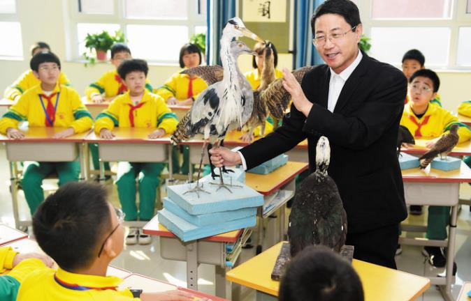 11月是河北省保護(hù)野生動物宣傳月,滄州市野生動物救護(hù)中心的專家走進(jìn)中小學(xué)校,向?qū)W生們宣講愛鳥護(hù)鳥知識,引導(dǎo)孩子們從小樹立尊重自然的生態(tài)文明理念,積極參與野生動物保護(hù)活動。圖為11月10日,在滄州市河間英華學(xué)校,滄州野生動物救護(hù)中心的專家孟德榮教授為學(xué)生們講解愛鳥護(hù)鳥知識。新華社發(fā) 傅新春 攝