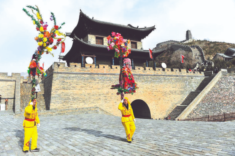 2月23日,在山西省代縣雁門關(guān),郝永俊(左)在進行撓閣表演。