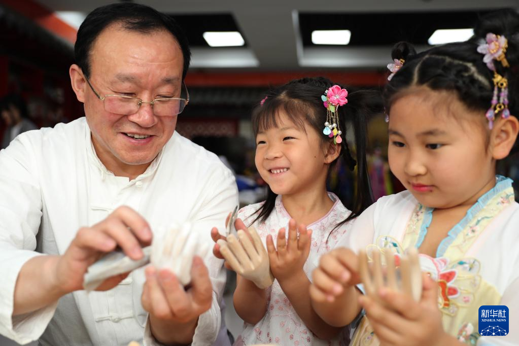 5月21日,在山東青島,姜玉濤給小朋友展示木偶制作工藝。