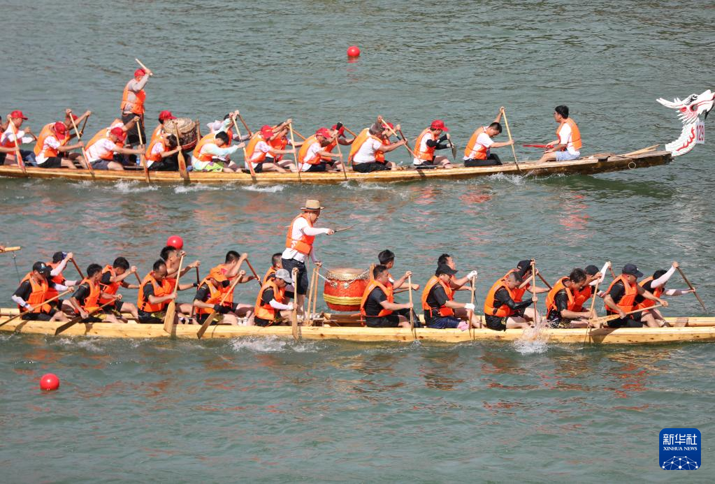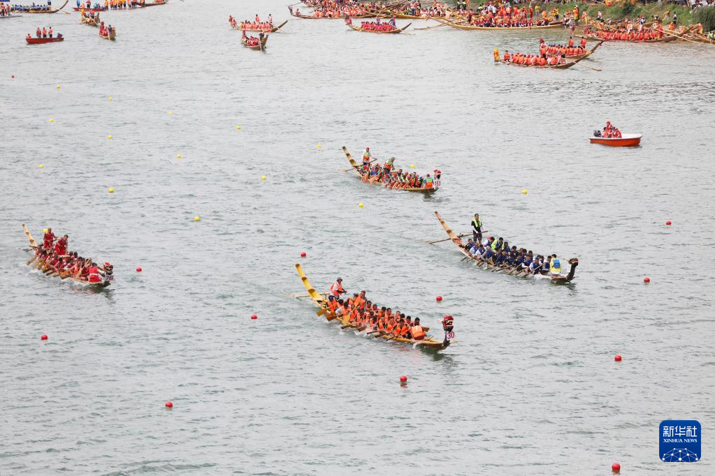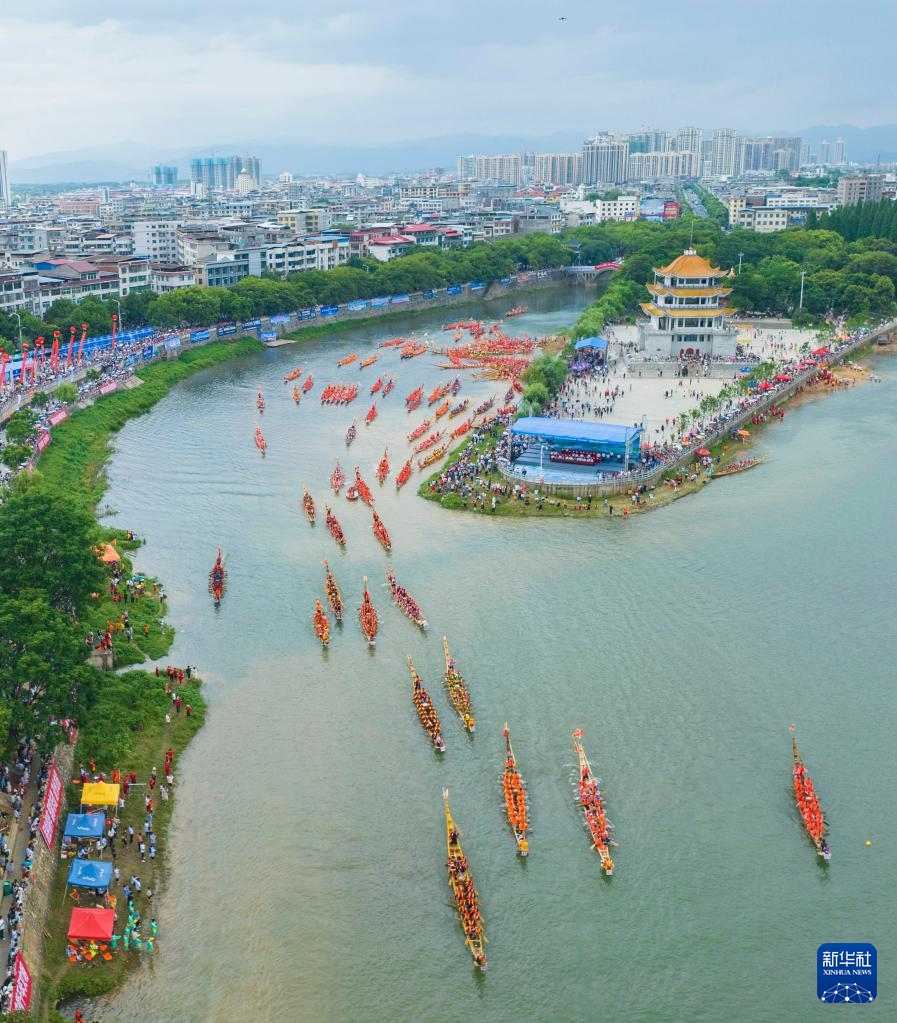 端午節(jié)臨近,湖南道縣舉行非遺龍船賽,眾多龍船在瀟水河上競(jìng)渡,迎接佳節(jié)到來。新華社發(fā)(蔣克青 攝)