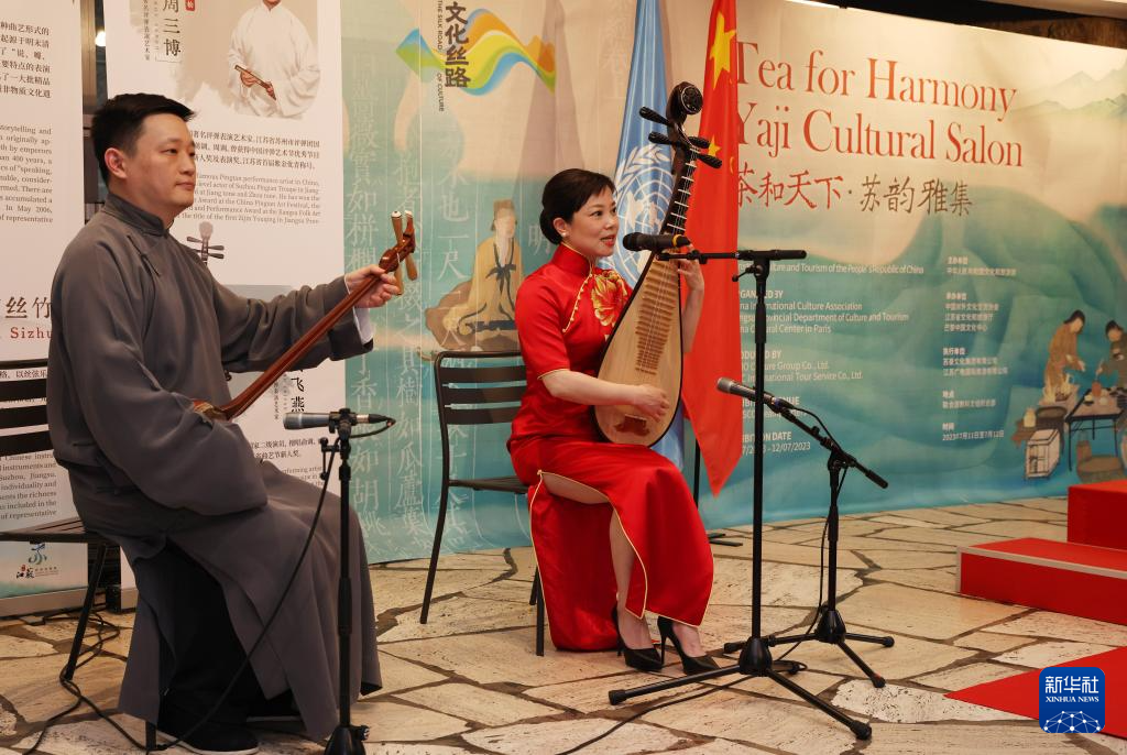 7月11日,在位于法國巴黎的聯(lián)合國教科文組織總部,中國評彈表演藝術(shù)家在活動上演奏。