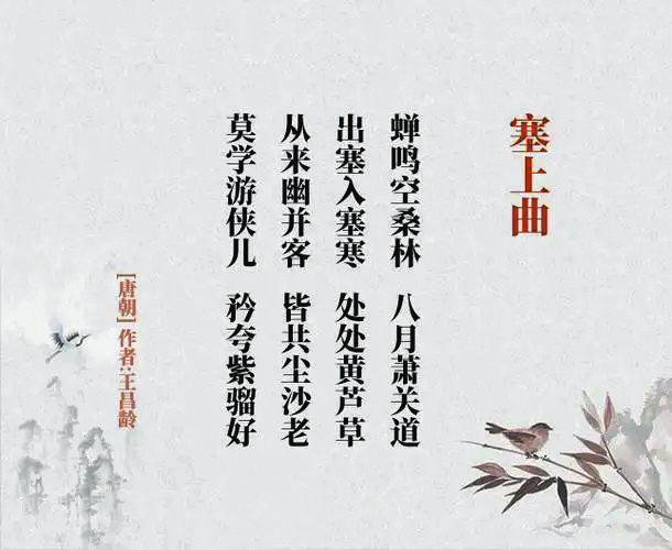 《塞上曲》唐(王昌齡):“蟬鳴空桑林,八月蕭關(guān)道。出塞入塞寒,處處黃蘆草。從來幽并客,皆共塵沙老。莫學(xué)游俠兒,矜夸紫騮好?!痹?shī)中的塞上、塞下,說穿了就是關(guān)外和關(guān)內(nèi)。但,其實(shí)景象沒什么特別,黃云、風(fēng)沙、駿馬、朔雪、美酒、桑林、關(guān)道、蘆草、沙場(chǎng),也似乎只有這些才能更符合邊塞詩(shī)人的審美。而“雁門關(guān)”成了李頎、王昌齡這對(duì)好友的共同命題。