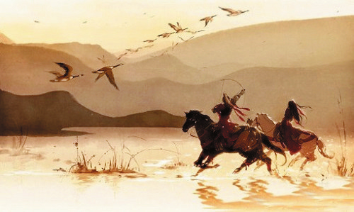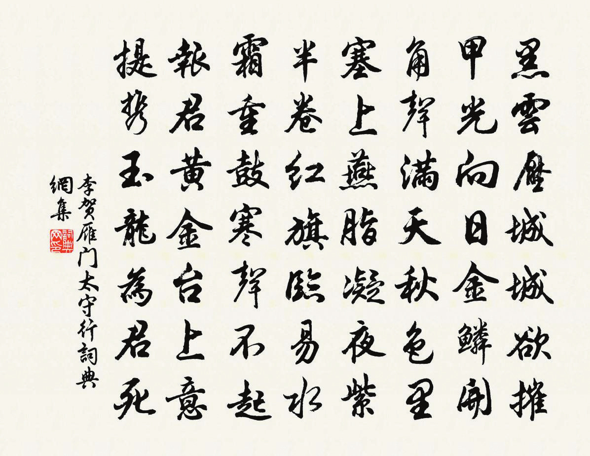 從詩(shī)仙手中接過筆的是“詩(shī)鬼”。李賀豪情萬(wàn)丈,大筆一揮,筆走龍蛇,一幅巨作石破天驚,橫空出世。之所以說是一幅巨作,是因?yàn)槔钯R筆下的這首詩(shī)的確太像一幅畫了:“黑云壓城城欲摧,甲光向日金鱗開。角聲滿天秋色里,塞上燕脂凝夜紫。半卷紅旗臨易水,霜重鼓寒聲不起。報(bào)君黃金臺(tái)上意,提攜玉龍為君死。”