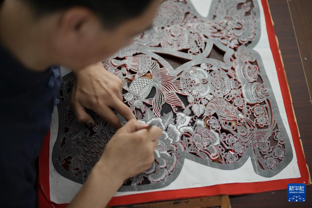 9月16日,剪紙藝人在玉田縣“非遺會客廳”工作室內(nèi)創(chuàng)作剪紙作品。