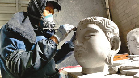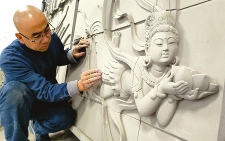 11月22日,晉中市太谷區(qū)晉派磚雕研究所,省級非遺項(xiàng)目晉派磚雕代表性傳承人溫建明正在為《飛天》磚雕作品進(jìn)行最后的創(chuàng)作。