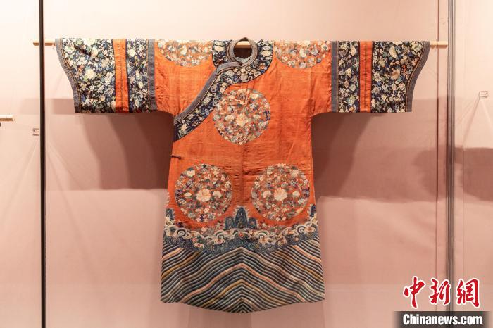 “這件吉服袍是清代滿漢服飾文化交融的重要見證:滿族作為北方游牧民族,為適應(yīng)騎射之需,其傳統(tǒng)袍服多為‘緊身窄袖’樣式,清代中后期,受到漢族女裝寬身博袖造型影響,滿族宮廷女性吉服袍的袖筒及馬蹄袖口變得更加肥闊。”田輝說。