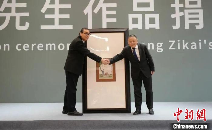 中國國家畫院院長劉萬鳴(左)接受豐子愷家屬捐贈的豐子愷國畫作品。 中國國家畫院供圖 豐子愷先生是中國現(xiàn)代漫畫的鼻祖,其作品以簡練線條和人物肢體語言傳達情感,展現(xiàn)對時代的觀察和關(guān)懷。此次捐贈的作品包括《兒童不知春問草何故綠》《翠拂行人首》《長條亂拂春波動》等六幅豐子愷先生作品和一幅豐氏家族合作手卷。 豐子愷之孫豐羽表示,作品的價值在于進入國家博物館、美術(shù)館或畫院,以典藏引領(lǐng)藝術(shù)發(fā)展。“今后畫院還可以辦展覽,讓廣大民眾來參觀、來欣賞作品,共同來弘揚中華優(yōu)秀傳統(tǒng)文化。”