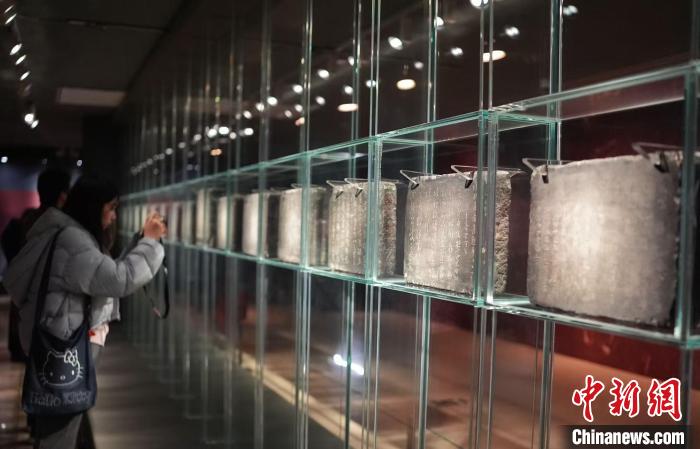 “墨韻文脈——甘肅絲路藝術珍品展”3月11日在中國美術館開幕,圖為觀眾正在欣賞明代的肅府本《淳化閣帖》刻石。 史春陽 攝