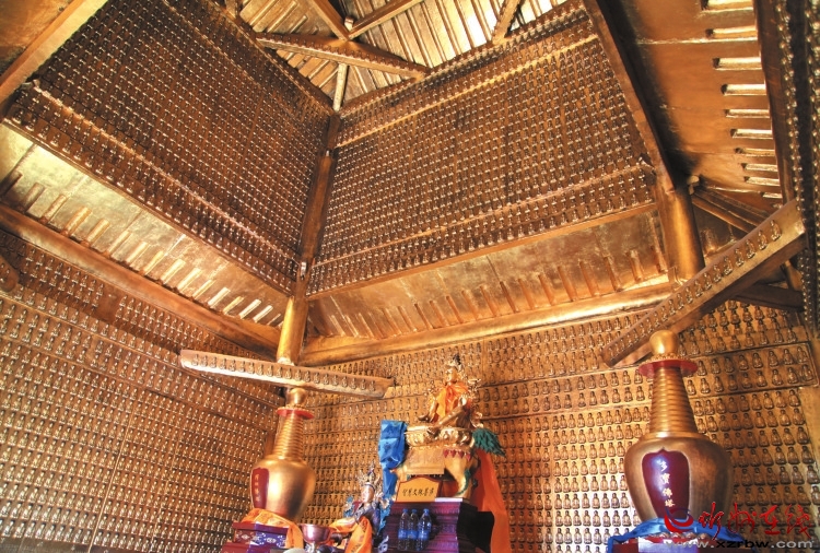 隔扇外壁鑄有36幅花卉圖案,有二龍戲珠、魚躍龍門、犀牛望月、玉兔拜月等,構(gòu)圖清晰,形象生動(dòng)。殿內(nèi)四壁滿鑄小佛,號(hào)稱萬佛,佛像形態(tài)各異,栩栩如生。殿內(nèi)正中供奉著一尊高達(dá)1米的銅鑄文殊騎獅像,其鑄藝高超,神態(tài)逼真,體態(tài)閑適,是明代銅鑄佛像之珍品。
