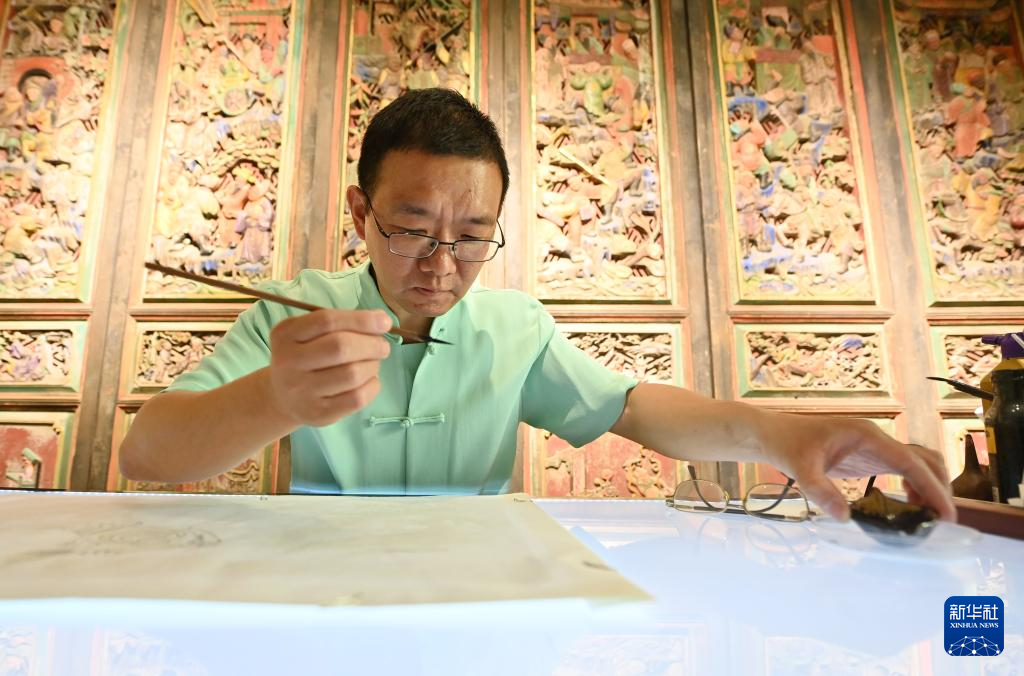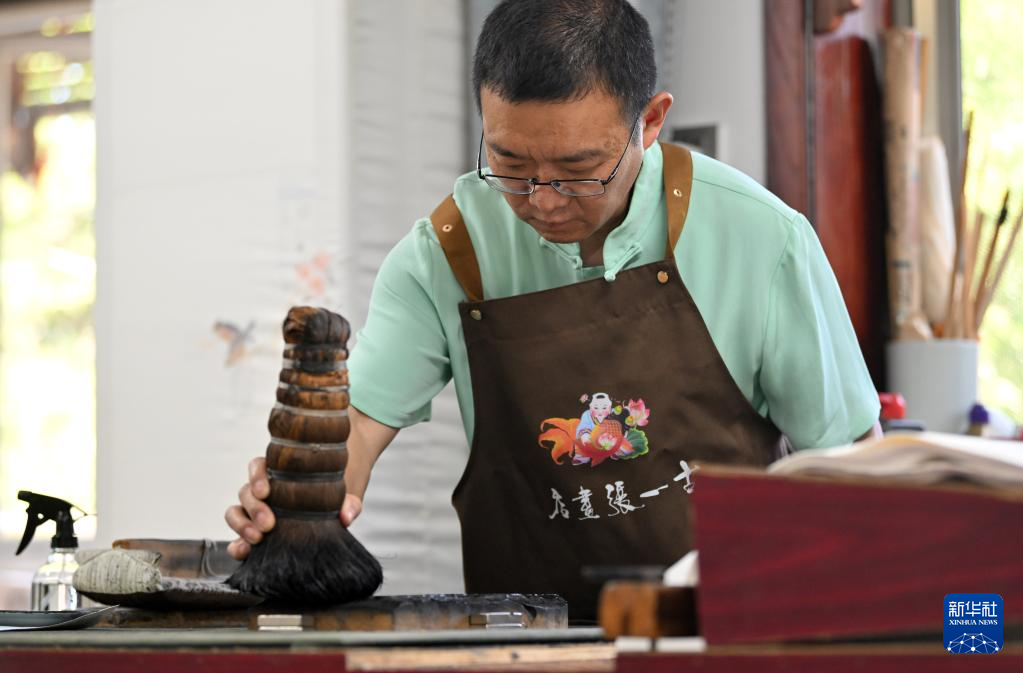 霍樹林在天津市西青區(qū)的楊柳青霍氏古一張畫店進行刷墨(6月6日攝)。