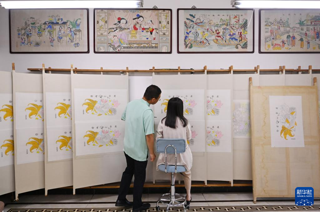 多年來,為了更好地保護傳承楊柳青木版年畫,霍樹林和父親將散落在各地的古版、畫稿搜集起來,籌建起一座年畫博物館,不同時期、風格各異的年畫古版有上百塊?;魳淞终f:“得讓年畫從墻上‘走下來’,吸引更多年輕人的目光。”如今,他和同為傳承人的妻子王丹一起將年畫元素與現(xiàn)代文創(chuàng)相結合,設計出的團扇、宮燈、撲克等產(chǎn)品,深受年輕消費者喜愛。新華社記者 李然 攝