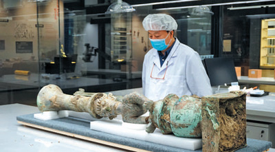 四川省文物考古研究院三星堆遺址工作站站長雷雨在查看拼對成功的鳥足曲身頂尊神像。新華社記者 肖 林攝