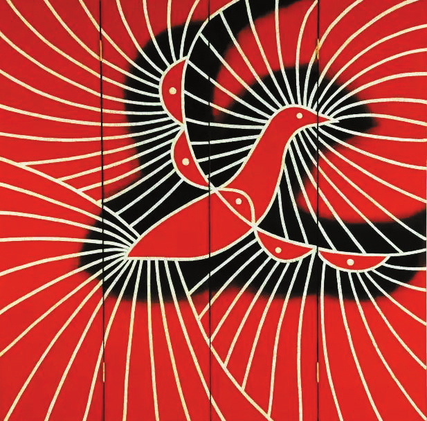 藝術(shù)家潘草原的《上升勢態(tài)》系列在制作方法上延續(xù)傳統(tǒng)工藝,使用不同質(zhì)地的瓦灰調(diào)入大漆制作背景,在表現(xiàn)形式上徹底顛覆固有的畫面結(jié)構(gòu),由符號(hào)化的裝飾元素組成。部落文化圖騰的抽象紋樣代表某種精神象征,將肉眼不可見的精神現(xiàn)象物質(zhì)化。有別于傳統(tǒng)“平光亮”的打磨工藝,藝術(shù)家利用瓦灰打磨后的不同灰度層次,在畫面中形成似霧朦朧的氤氳氛圍。鑲嵌的寶石、金屬和螺鈿,不同材質(zhì)折射的光澤質(zhì)感與大漆的黑、瓦灰形成鮮明對(duì)比,符號(hào)圖騰在二維平面中顯示一種“上升勢態(tài)”。如今,在世界文明交流互鑒的新時(shí)代,深得中華傳統(tǒng)文化神韻的大漆藝術(shù)應(yīng)該秉持兼收并蓄的原則,煥發(fā)出新的時(shí)代光彩。(黃雨田)