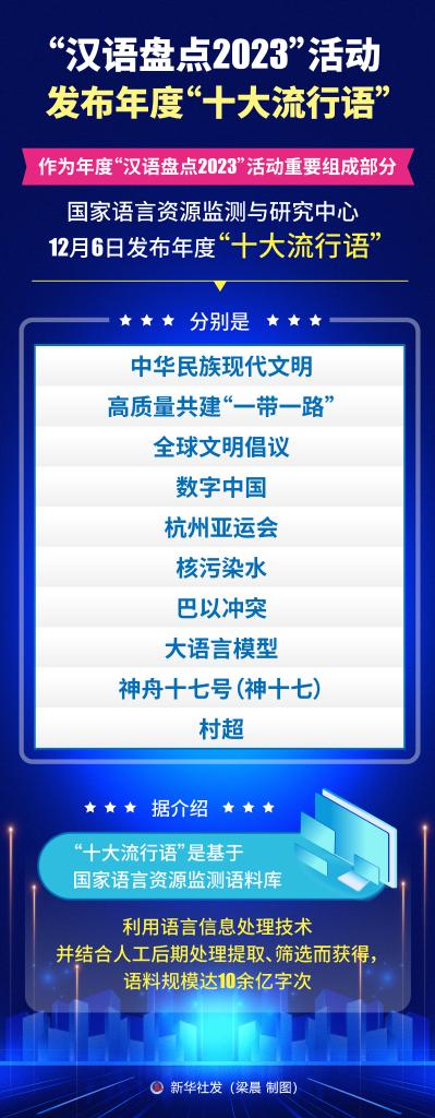 新華社北京12月6日電(記者史競(jìng)男)作為年度“漢語(yǔ)盤(pán)點(diǎn)2023”活動(dòng)重要組成部分,國(guó)家語(yǔ)言資源監(jiān)測(cè)與研究中心12月6日發(fā)布年度“十大流行語(yǔ)”,分別是:中華民族現(xiàn)代文明、高質(zhì)量共建“一帶一路”、全球文明倡議、數(shù)字中國(guó)、杭州亞運(yùn)會(huì)、核污染水、巴以沖突、大語(yǔ)言模型、神舟十七號(hào)(神十七)、村超。