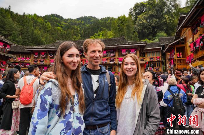 4月11日,在廣西桂林市龍勝各族自治縣龍脊梯田景區(qū)黃洛瑤寨,外國(guó)友人合影留念。 楊宗盛 攝