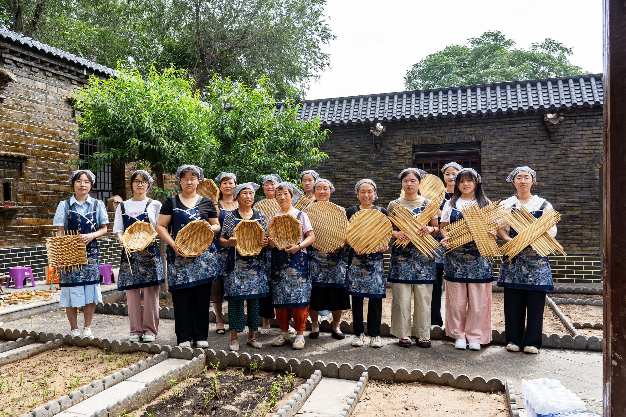 現(xiàn)場,青磚灰瓦老式房屋建筑,充滿年代感。幾位年近70歲的老藝人在院中圍坐,制作起箅簾來動作嫻熟,眼隨手走,針線在高粱稈間上下穿梭,擠緊、壓實、細(xì)縫、剪圓,每道工序十分嚴(yán)謹(jǐn)。學(xué)生們有模有樣地學(xué)做,不時向老人請教交流,現(xiàn)場氣氛活躍、趣味十足。一個多小時,一個個手工制作的箅簾、兜嘍箅基本成型,看著自己的勞動成果,大家臉上洋溢著喜悅的笑容。
