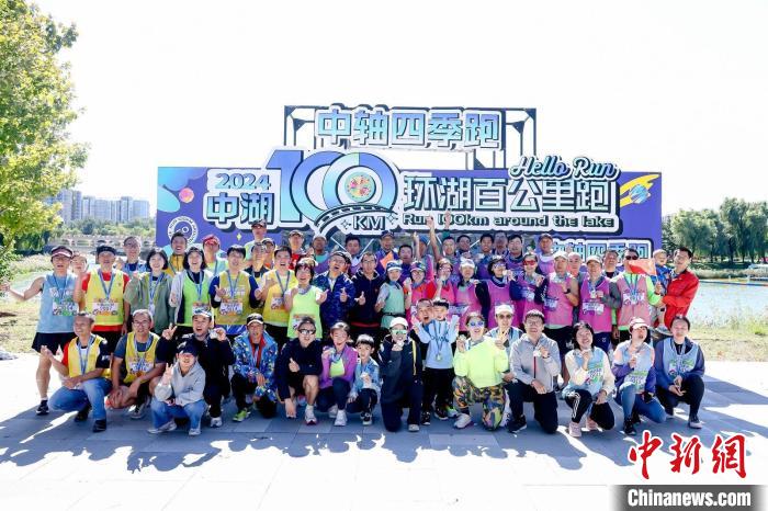 參加百公里環(huán)湖跑活動的跑者們合影。 龍?zhí)吨泻珗@供圖