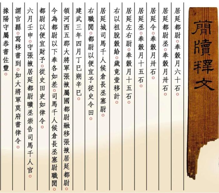 “建武三年四月丁巳朔辛巳,領(lǐng)河西五郡大將軍張掖屬國都尉融移張掖居延都尉,今為都尉以下奉各如差,司馬千人候倉長丞塞尉職閑,都尉以便宜財予,從史田吏如律令……”出土于內(nèi)蒙古額濟納旗甲渠候官遺址的《建武三年居延都尉吏奉例》由10枚簡組成,每簡長22.8厘米,前兩簡寬2.5厘米、其余8簡寬1.4厘米,全文200字。