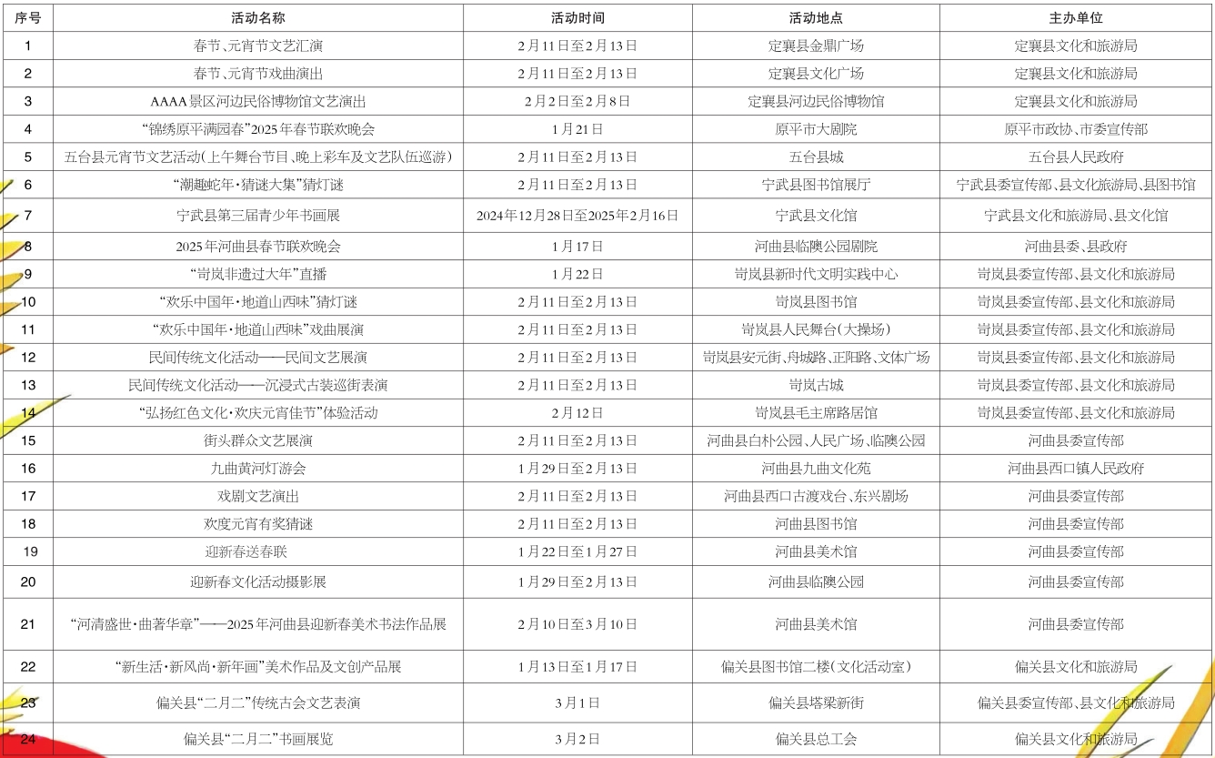 為給廣大市民、游客提供豐富多彩的“文旅大餐”,我市宣傳文化部門精心策劃推出文化文藝惠民活動(dòng),涵蓋春節(jié)民俗、文藝演出、非遺體驗(yàn)、戲曲展演、夜景燈展、巡游街演、書畫展出等多種形式,為廣大群眾奉上家門口的文化盛宴,營(yíng)造歡樂(lè)祥和、喜慶熱烈、文明向上的濃厚節(jié)日氛圍,滿滿“新年味”,濃濃“煙火氣”,給足過(guò)年“儀式感”。