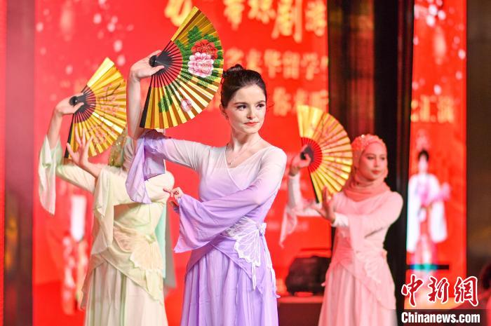 1月22日晚,海南省來(lái)華留學(xué)生“瓊韻華章之瓦唱瓊劇、你來(lái)聽(tīng)”非遺匯演在??谂e行,外國(guó)留學(xué)生表演折扇舞。 肖若洋 攝