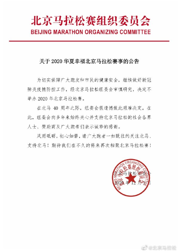 人民網(wǎng)北京12月3日電(楊磊) 12月3日,北京馬拉松組委會(huì)在官方微博上宣布,2020年北京馬拉松將不再舉辦。