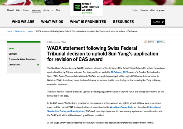 在得知瑞士最高法院撤銷(xiāo)對(duì)孫楊的裁決后,WADA對(duì)此事發(fā)表聲明稱(chēng),已得知瑞士聯(lián)邦最高法院支持孫楊對(duì)CAS判決的改判請(qǐng)求,會(huì)積極采取行動(dòng),在案件回到國(guó)際體育仲裁法庭后,繼續(xù)陳述其立場(chǎng)。聲明如下: