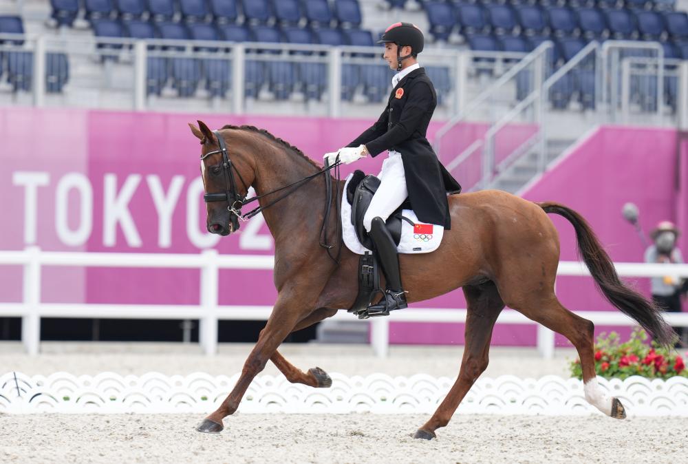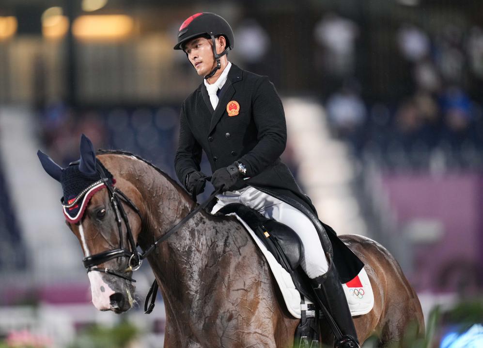 2021年7月30日,中國選手孫華東在東京奧運會馬術三項賽盛裝舞步首日比賽中。新華社記者 朱崢 攝