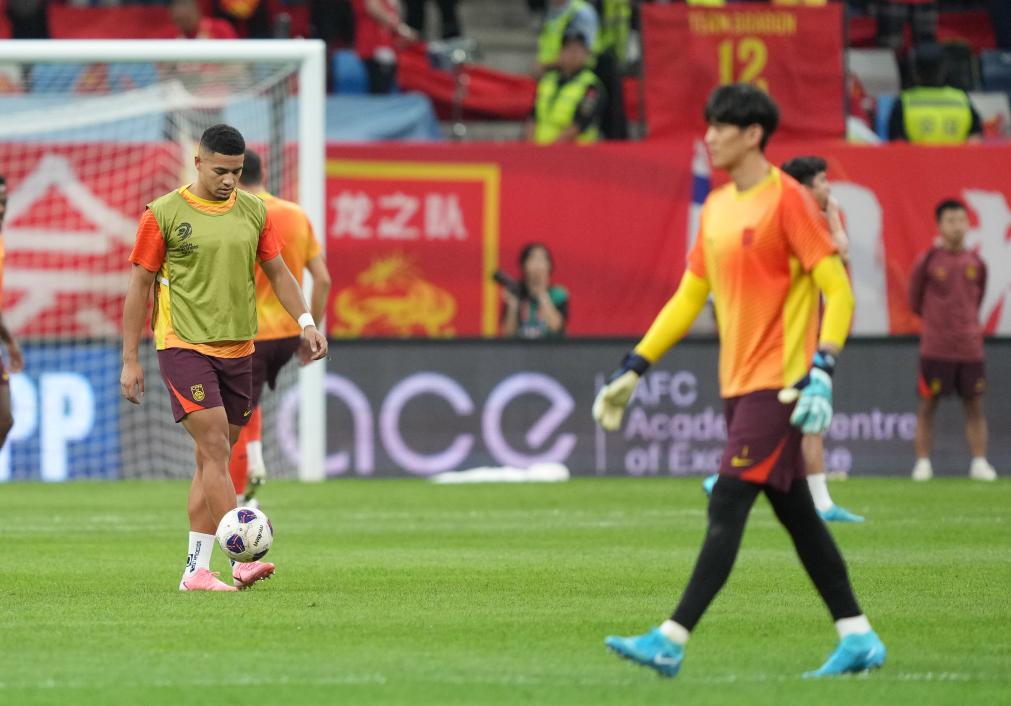 圖為9月10日,蔣光太(左)在2026年國(guó)際足聯(lián)世界杯亞洲區(qū)預(yù)選賽18強(qiáng)賽C組第二輪比賽前熱身。新華社記者 潘昱龍 攝