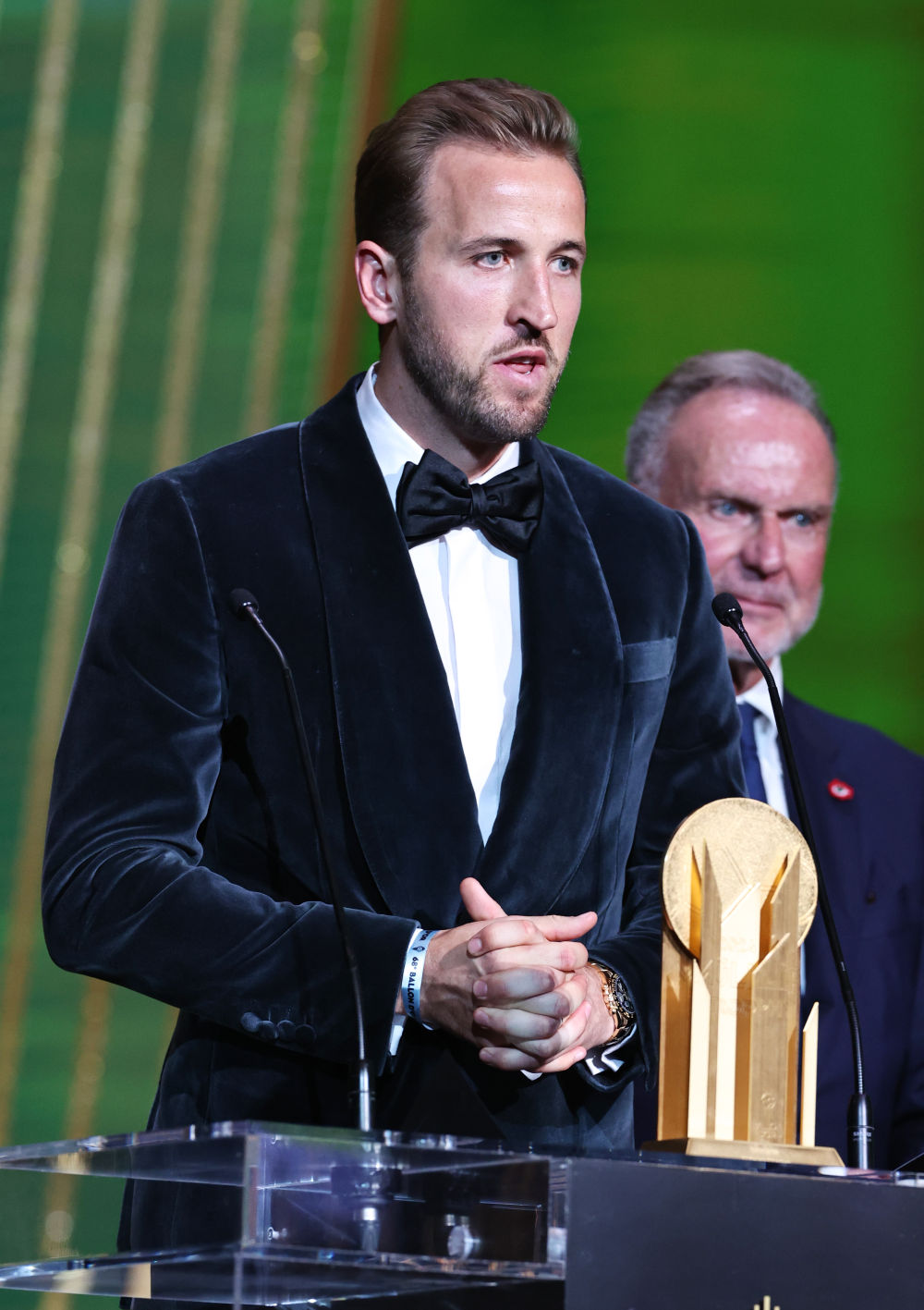 10月28日,英格蘭球員凱恩在頒獎典禮上發(fā)言,他與法國球員姆巴佩共同獲得獲得象征最佳前鋒的“蓋德·穆勒獎”。新華社記者 高靜 攝