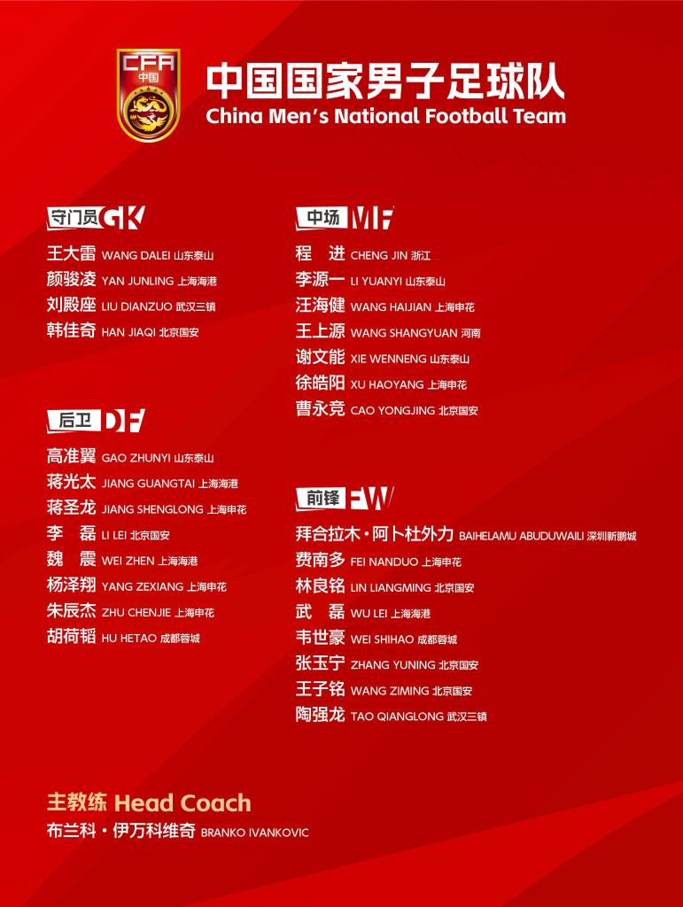 武磊、顏駿凌、蔣光太、魏震(上海海港),王大雷、李源一、高準(zhǔn)翼、謝文能(山東泰山),程進(jìn)(浙江),韋世豪、胡荷韜(成都蓉城),費(fèi)南多、楊澤翔、徐皓陽(yáng)、朱辰杰、蔣圣龍、汪海?。ㄉ虾I昊ǎ罾?、張玉寧、林良銘、王子銘、曹永競(jìng)、韓佳奇(北京國(guó)安),劉殿座、陶強(qiáng)龍(武漢三鎮(zhèn)),王上源(河南),拜合拉木·阿卜杜外力(深圳新鵬城)。