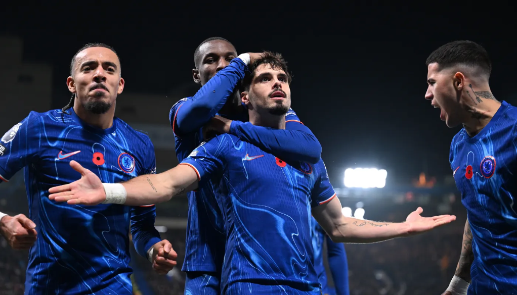 切爾西隊球員內(nèi)托(右二)慶祝進(jìn)球。圖片來自英超官網(wǎng)