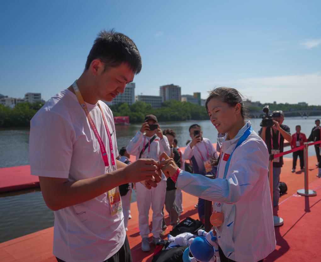 11月28日,何國潤(右)的男朋友向她求婚。當(dāng)日,在海南省三亞市舉行的第十二屆全國少數(shù)民族傳統(tǒng)體育運動會獨竹漂女子組200米直道賽頒獎儀式后,海南隊選手何國潤的男朋友在頒獎儀式現(xiàn)場向她求婚,上演溫情一幕。新華社發(fā)(杜笑微攝)