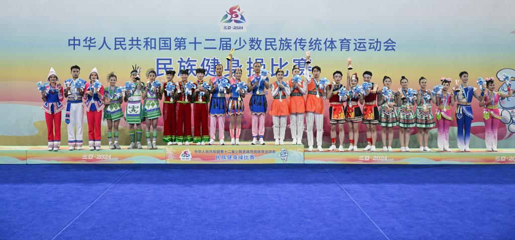 11月28日,這是第十二屆全國少數(shù)民族傳統(tǒng)體育運動會民族健身操自選套路(輕器械)頒獎儀式現(xiàn)場。新華社記者 孫凡越 攝