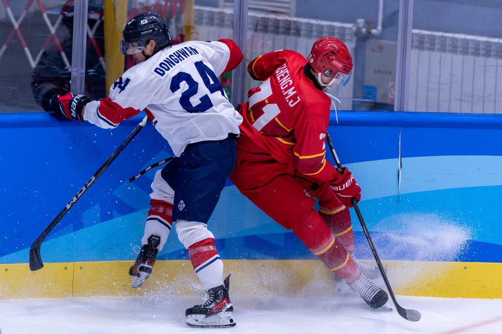 2月4日,中國(guó)隊(duì)球員鄭明舉(右)在比賽中拼搶。新華社記者 黃偉 攝