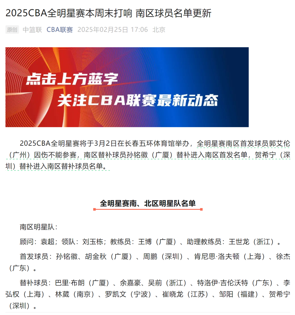 新華社北京2月25日電 中國(guó)男子籃球職業(yè)聯(lián)賽(CBA)25日宣布,全明星賽南區(qū)首發(fā)球員郭艾倫因傷不能參賽,南區(qū)替補(bǔ)球員孫銘徽替補(bǔ)進(jìn)入南區(qū)首發(fā)名單。