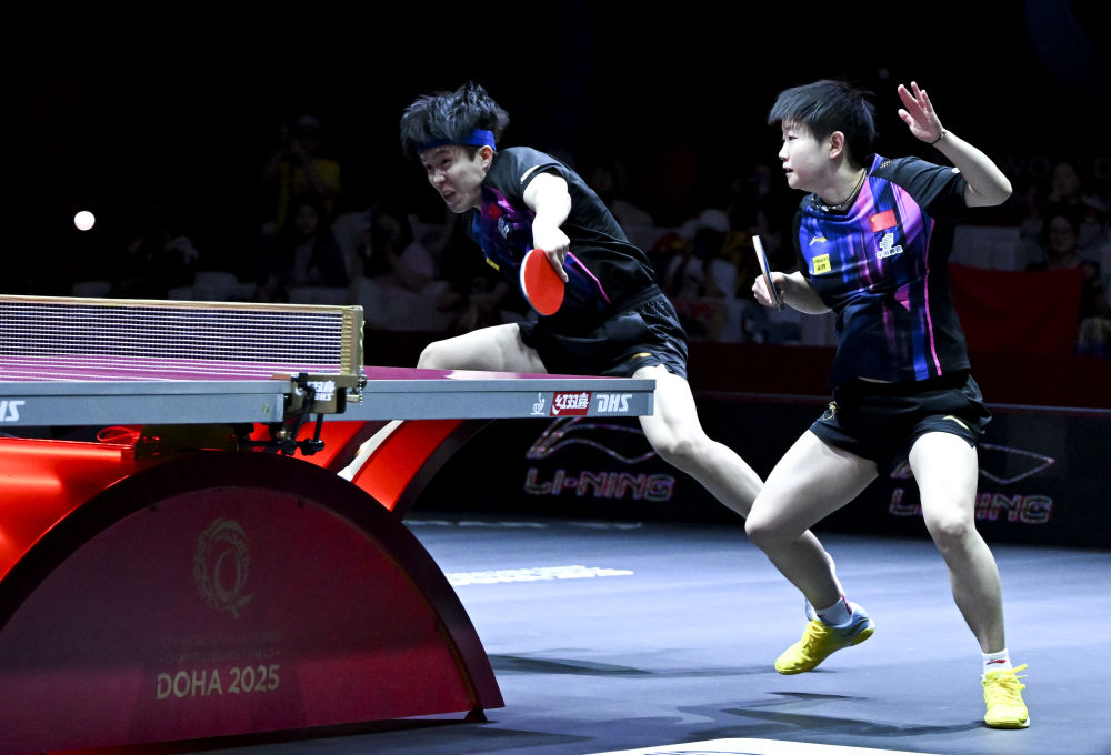 5月22日,王楚欽(左)/孫穎莎在比賽中。新華社記者 賀長(zhǎng)山 攝