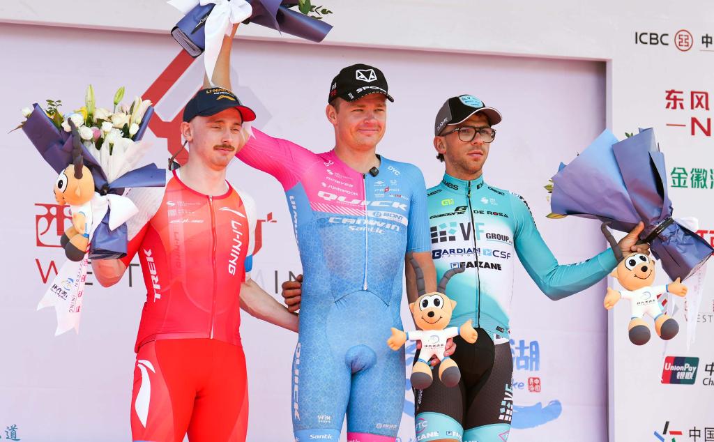 7月9日,賽段冠軍愛沙尼亞快客車隊車手拉亞斯·馬?。ㄖ校?、亞軍李寧之星車隊車手謝爾比·亞歷山大(左)、季軍意大利巴迪亞尼車隊車手扎農(nóng)塞洛·恩洛科在領(lǐng)獎臺上合影。新華社記者 齊芷玥 攝