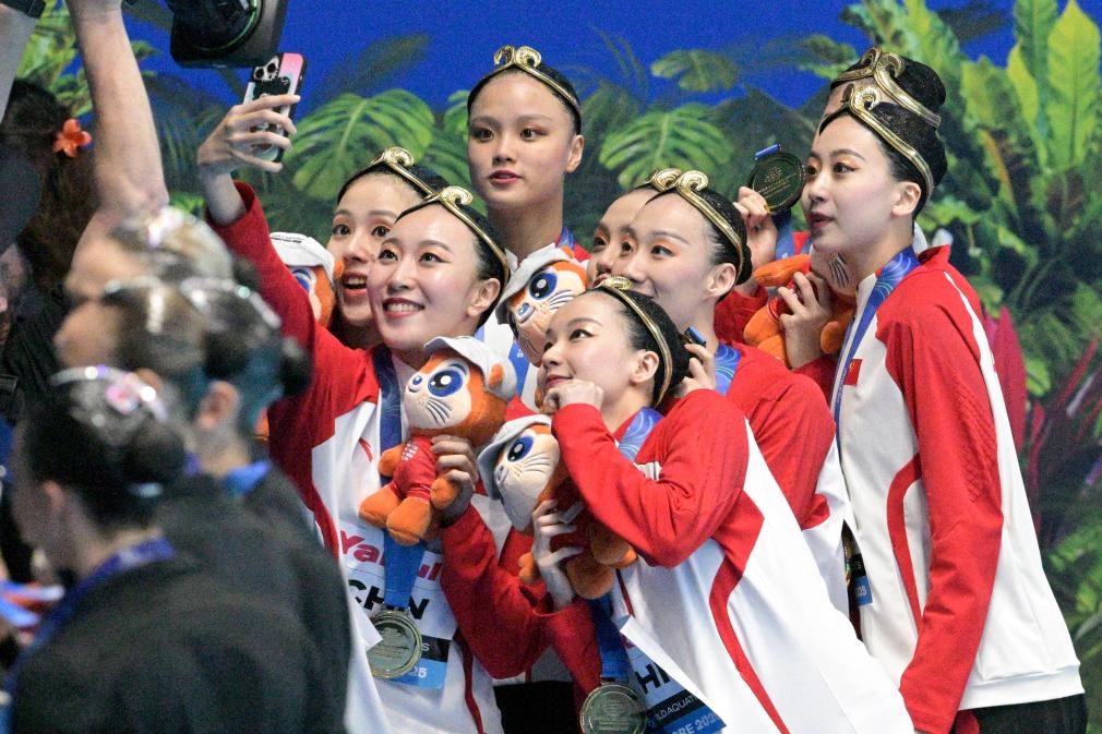 22日晚,2025年游泳世錦賽花游集體技術(shù)自選決賽,預賽排名第一的中國隊最后登場。中國隊沿用了世界杯總決賽時的“悟空”主題,比賽中姑娘們頭戴金箍,化身“天命人”,伴隨著《黑神話·悟空》的配樂,在水中翩翩起舞。